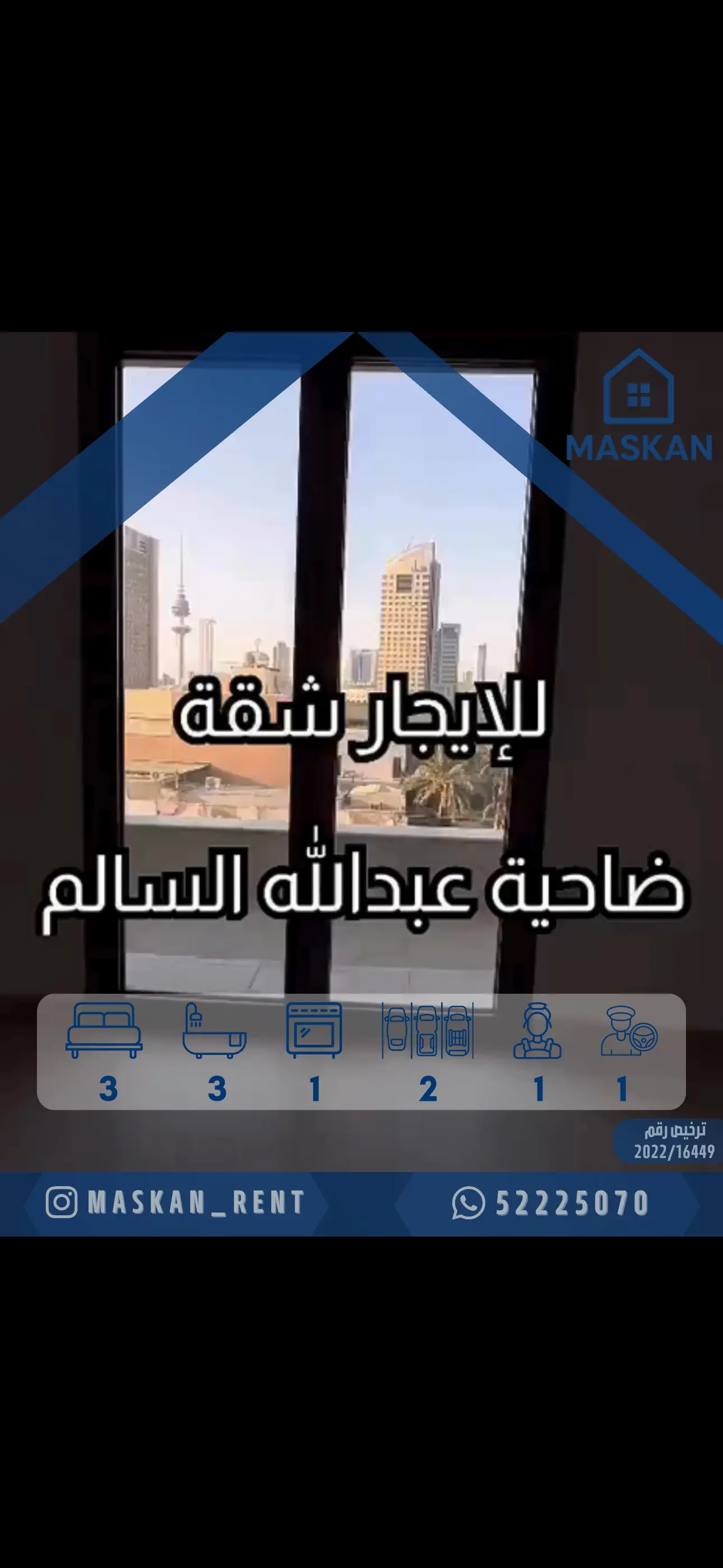 🔹للإيجار شقة في ضاحية عبدالله السالم🔹 🔸 3 غرفه نوم ماستر 🔸 صالة استقبال مع حمام ضيوف 🔸 غرفه خادمه 🔸مطبخ 🔸متوفر غرف للسواق (50دك) 🏷️ الإيجار: 700 دك نسما العقارية 📞52225070 NREC034